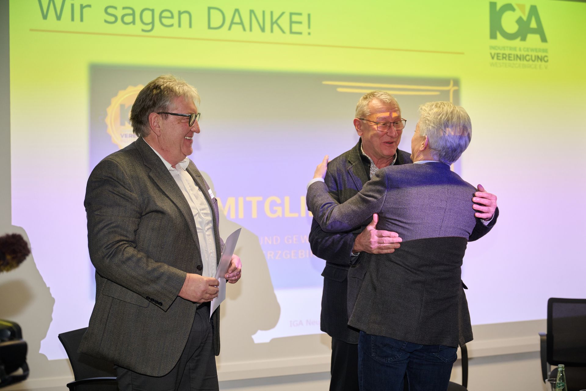Gründungsmitglieder der Industrie- und Gewerbevereinigung Westerzgebirge e.V. Lutz Lorenz und Detlef Süß wurden auf dem IGA-Neujahrsempfang am 15. Januar 2025 bei der Porsche Werkzeugbau GmbH in Schwarzenberg mit der Ehrenmitgliedschaft gewürdigt.